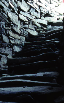 The stairway in Dun Carloway Gearrannan prospered for a while – there were 84 children at the local school in 1904 – but the Depression took its toll. The post-Second World War years saw high emigration until the last inhabitants – three elderly spinsters – moved out in 1974 and the blackhouses began to decay. Restoration by the Gearrannan Village Trust began in 1989 and has been completed at a cost of £1.25 million. Now, visitors can explore the village – run mainly by volunteers – and see demonstrations of traditional crafts, including butter making, spinning, and weaving the famous Harris Tweed. The design of the blackhouses has its roots in the Nordic longhouse. A restored Norse watermill near Gearrannan looks very similar to the blackhouses. The islands were under Norwegian rule until 1266 and evidence of this long occupation can be found in the Gaelic language, particularly place names. Human occupation goes back much further than the Vikings. The west coast of Lewis has some of the finest prehistoric monuments in Britain. Not far from Gearrannan is Callanish, a mysterious circle with two long avenues of stones laid out in roughly the shape of a Celtic cross. Built 5,000 years ago, the 50 monoliths stand some 15 feet high. Callanish lines up with 11 other megalithic sites, including two impressive stone circles within walking distance. Access to the stones is a pleasant surprise. There were few visitors and it was wonderful to be able to walk among – and touch – the stones.